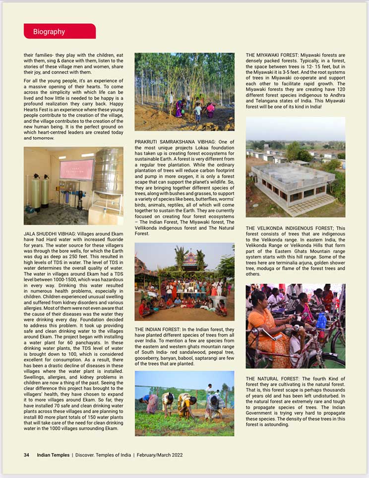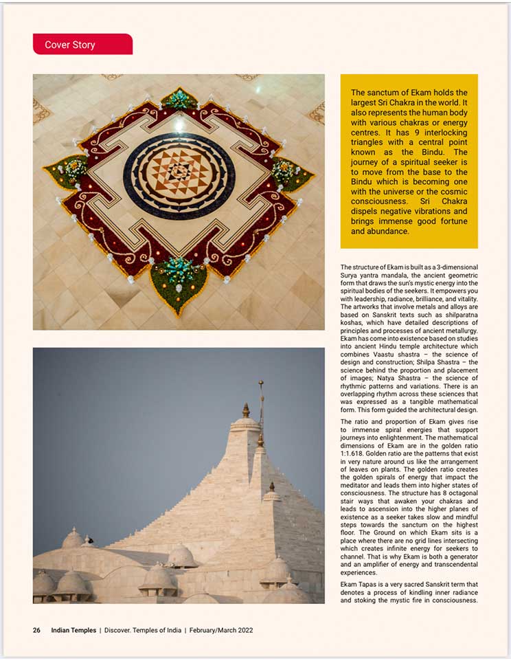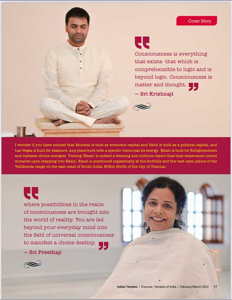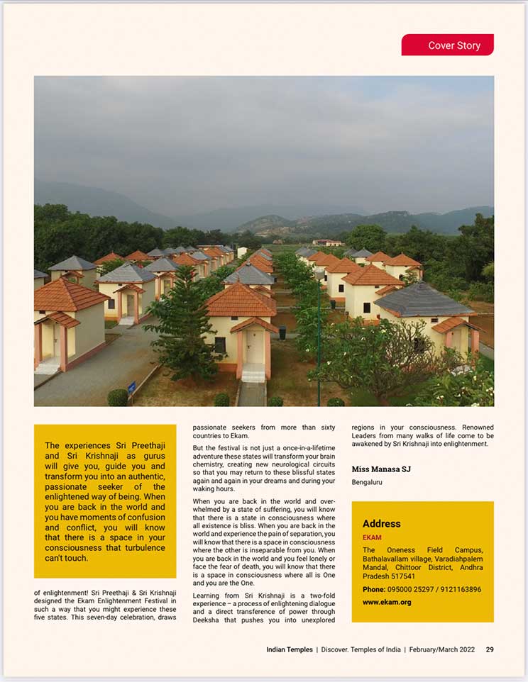 スピリチュアル雑誌、『Indian Temples(インドの寺院)』のカバーストーリーに掲載されました。エーカムつまり覚醒のためのビジョンを持つことで最も尊敬されているシュリ・プリタジとシュリ・クリシュナジは、大変敬意を払われ、幅広く読まれているスピリチュアル雑誌『Indian Temples(インドの寺院)』の20ページに渡り掲載されました。
